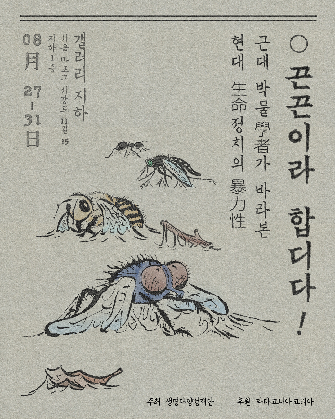근대 박물학의 분류와 관찰의 시선, 그리고 현대 사회가 생명을 관리하고 통제하는 생명정치적 폭력이 교차하는 지점에서, 이 전시는 우리가 무심코 지나쳐 온 ‘끈끈한’ 풍경을 다시 바라보게 합니다. 끈끈이트랩에 붙어 사라져간 수많은 작은 생명들을 통해, 인간이 자연을 바라보는 방식과 그 윤리적 질문을 관객에게 되묻습니다.